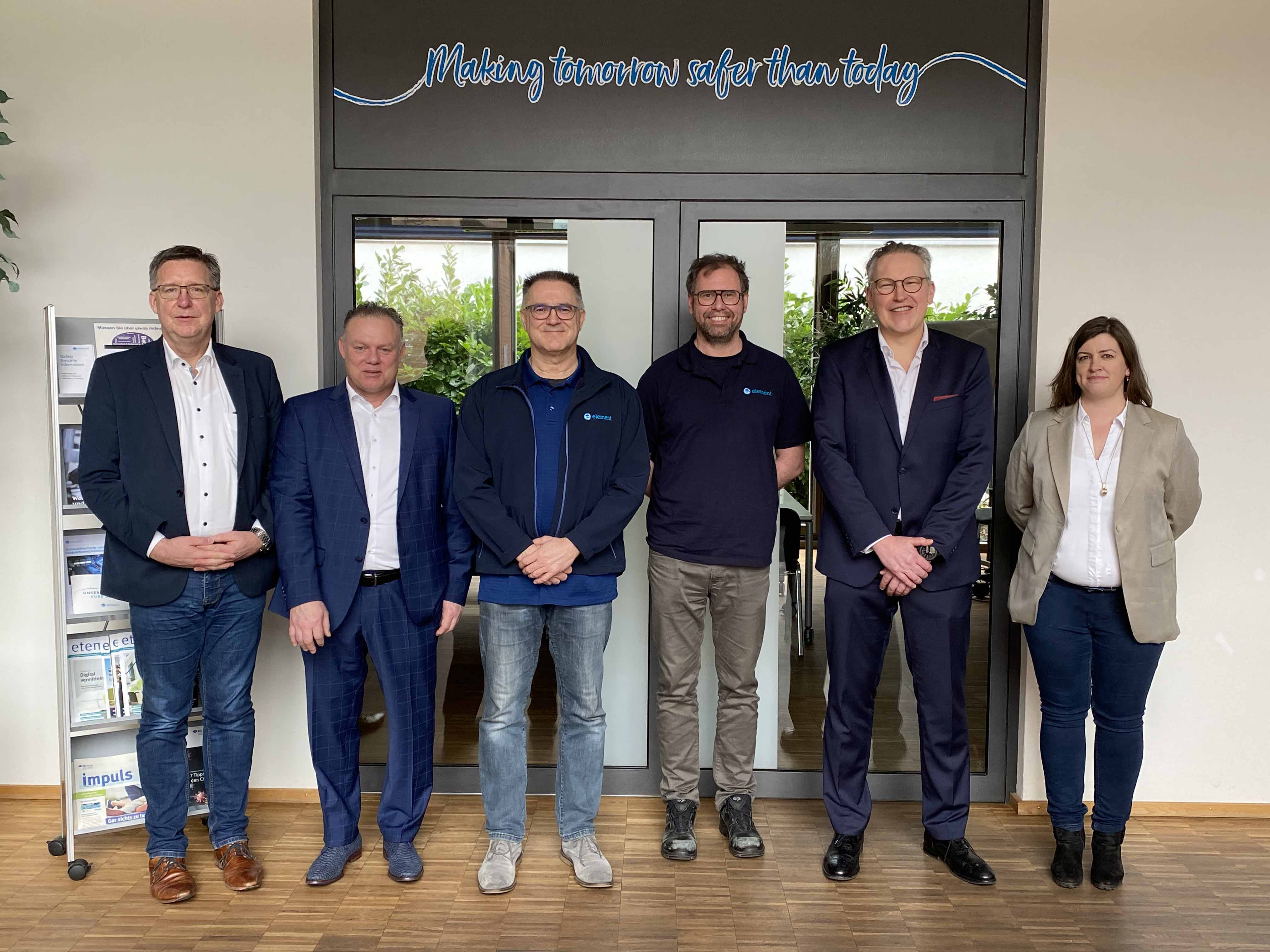 (Von links nach rechts) Dr. Andreas Bracke, Teamleader Germany North (LRQA); Rob Sanders, Corporate Account Manager Northern Europe (LRQA); Dr. Manfred Feyer, Geschäftsführer (ELEMENT); Andreas Wachholz, Operations Manager (ELEMENT); Mathias Matschke, Country Operations Manager Inspection Services Germany/Austria (LRQA); Kerstin Alhajsuleiman, Marketing Managerin (LRQA)