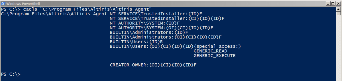 We noticed that folders within the Altiris file structure had the ‘Everyone – Full Control’ permission applied. These folders seemed to contain fairly benign content, such as scan configuration files and XML files, from what we believed to be the inventory scan or output from a recent task. These folder and file permissions were found using a simple PowerShell one liner which allowed us to perform an ACL review on any Windows host, using only the tools on that host. An example of this one liner is as follows:Get-ChildItem C:\ -Recurse -ErrorAction SilentlyContinue | ForEach-Object {try {Get-Acl -Path $_.FullName | Select-Object pschildname,pspath,accesstostring} catch{}}|Export-Csv C:\temp\acl.csv -NoTypeInformation