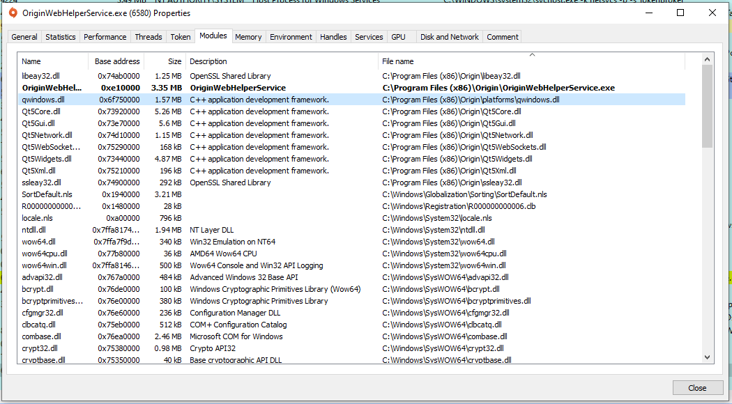 Our next course of action was to have a look at one of the service processes OriginWebHelperService.exe process using another free tool called ProcessHacker [3]. Something immediately stood out to us, which can be seen in the image below;OriginWebHelperService.exe is loading a DLL qwindows.dll from the directory C:\Program Files (x86)\Origin\platforms\.