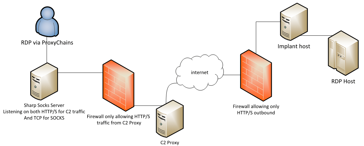 When performing a simulated attack (red team), or indeed many other types of test, SOCKS proxies become an integral tool during the “Act on Objectives” phase of the kill chain. For example, if the target is behind the network perimeter, is a system accessible via RDP, is an intranet site or is a Citrix hosted application, the SOCKS proxy becomes an essential tool. It can allow access to those “internal only” resources, through an established implants C2 (Command and Control). The diagram below shows a typical scenario in a red team: