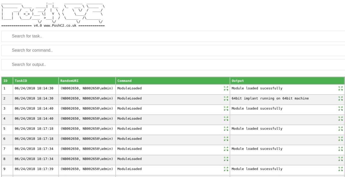 While this hasn’t changed significantly since the first iteration of PoshC2, it’s one of the most important elements of the tool. It will fundamentally assist in the SOC detection and response phase of your engagements, i.e. when assessing the response of the Blue Team. It is, of course, also a professional requirement to have full logs of offensive activity.