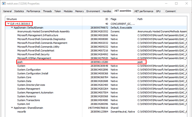 For visibility, it is possible to identify if PoshC2 is running in another process by using Process Explorer which comes as part of the sysinternals suite (https://docs.microsoft.com/en-us/sysinternals/). This allows you to see if any .NET assemblies have been loaded into the running process. If the process is in fact PoshC2, there is a known Indicator of Compromise when running the CLR v4.0.30319 because you will see a DLL loaded called ‘posh’. This does not appear in .NET version two, as shown in the examples below.