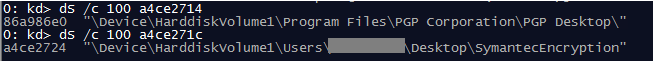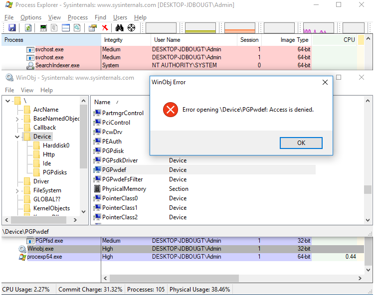 Before opening Windbg, we decided to perform a fast check over all running processes, in order to find out if at that point there was any process with an open handle to that device object. The results of that check were even more interesting. In fact, there was a process called PGPtray.exe that had an open handle to the aforementioned device object. That process was running with Medium Integrity Level [4], though.