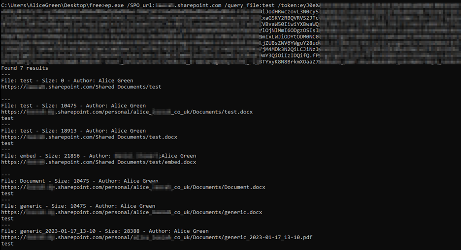 By passing the SPO_url, the xxx.sharepoint.com of the organization’s targeted SharePoint and query_file with a keyword we want to search files for, we can obtain the full URLs of the files that were found, as well as their author, filetype and size.
