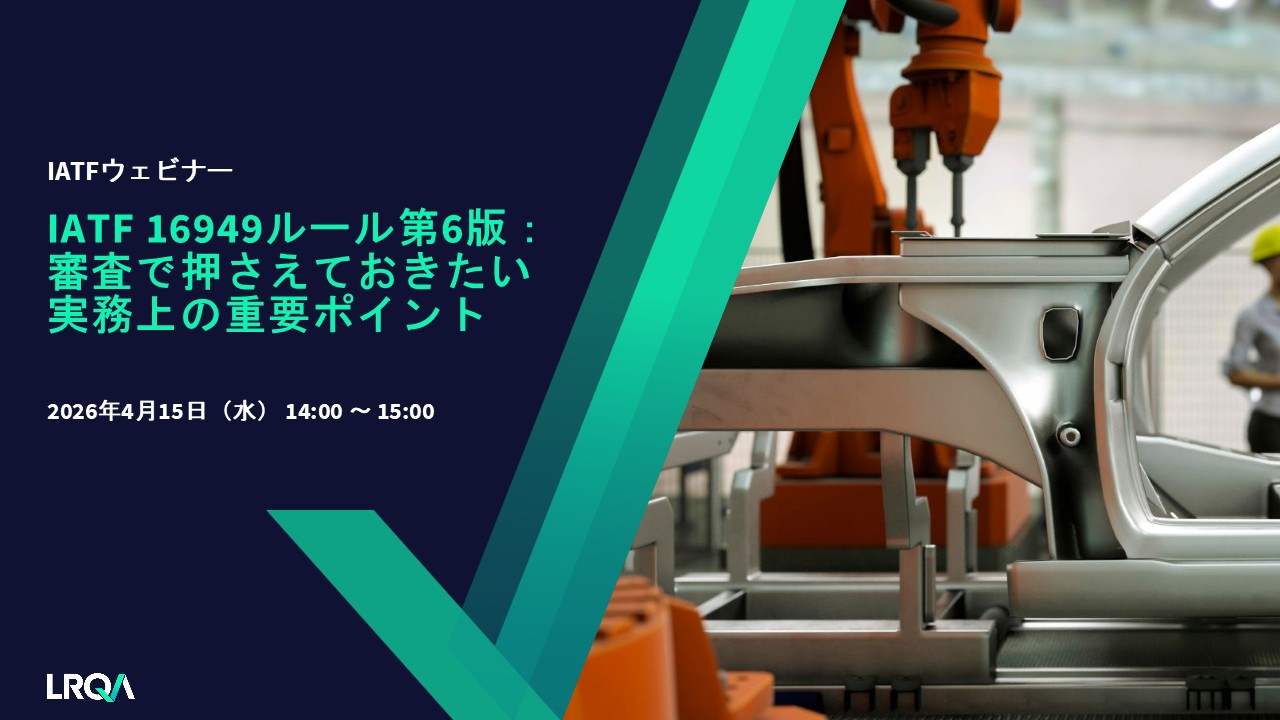 この度、LRQAは4/15(水)に、IATF 16949ルール第6版の運用に関する最新情報をお届けするウェビナーを開催いたします。実務で判断に迷いやすい論点に焦点を当て、審査の現場で押さえておきたいポイントをわかりやすく解説します。