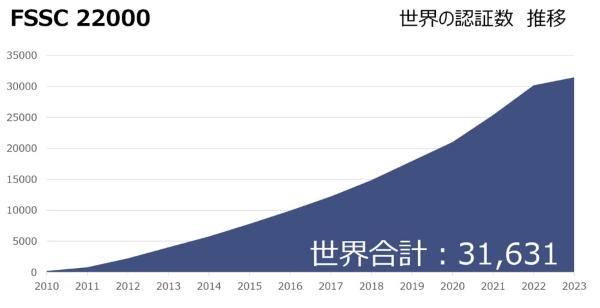 FSSC 22000(Food Safety System Certification 22000)は、食品安全の管理手法HACCP(ハサップ)と国際規格ISO 22000を包含した食品安全マネジメントシステムに関する国際規格です。現在の認証件数は世界で31,631件、日本で3,174件、現在に至るまで増加の一途を辿っています。