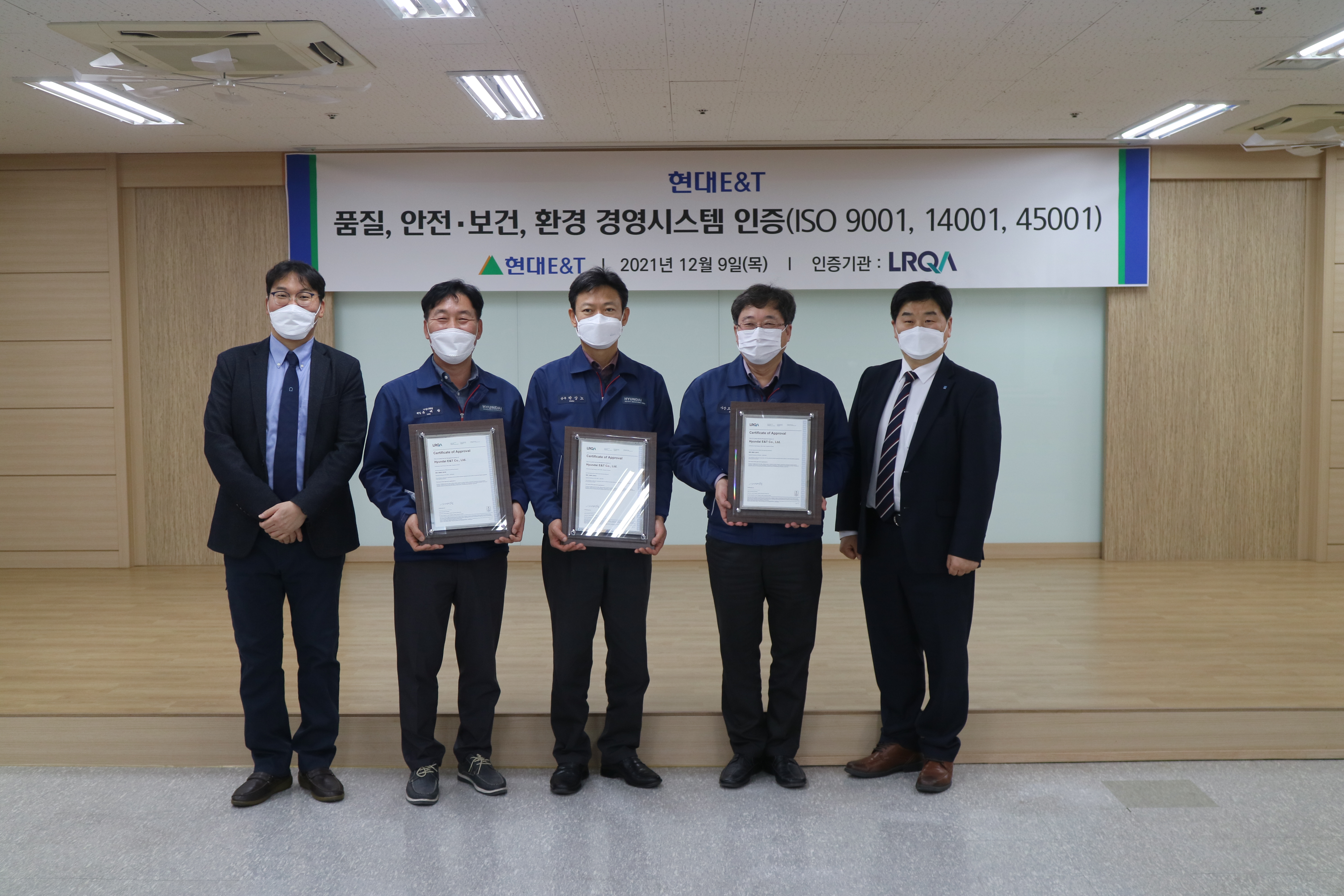 지난 9일,  울산 현대 E&T 본사에서 품질 경영시스템  ISO9001, 환경경영시스템  ISO14001, 안전보건 경영시스템   ISO45001 인증 획득을 기념하는 인증 수여식이 진행되었습니다.
