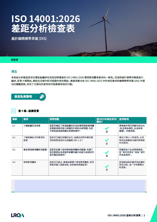 該檢查表是一個實用的自我評估工具,旨在協助組織識別現行環境管理體系與ISO 14001:2016標準草案(DIS)要求之間的差距。DIS突顯了自2015版本以來發生的變化以及可能需要採取的行動,是進行審核準備、合規規劃以及根據修訂標準推動持續改善的重要資源。